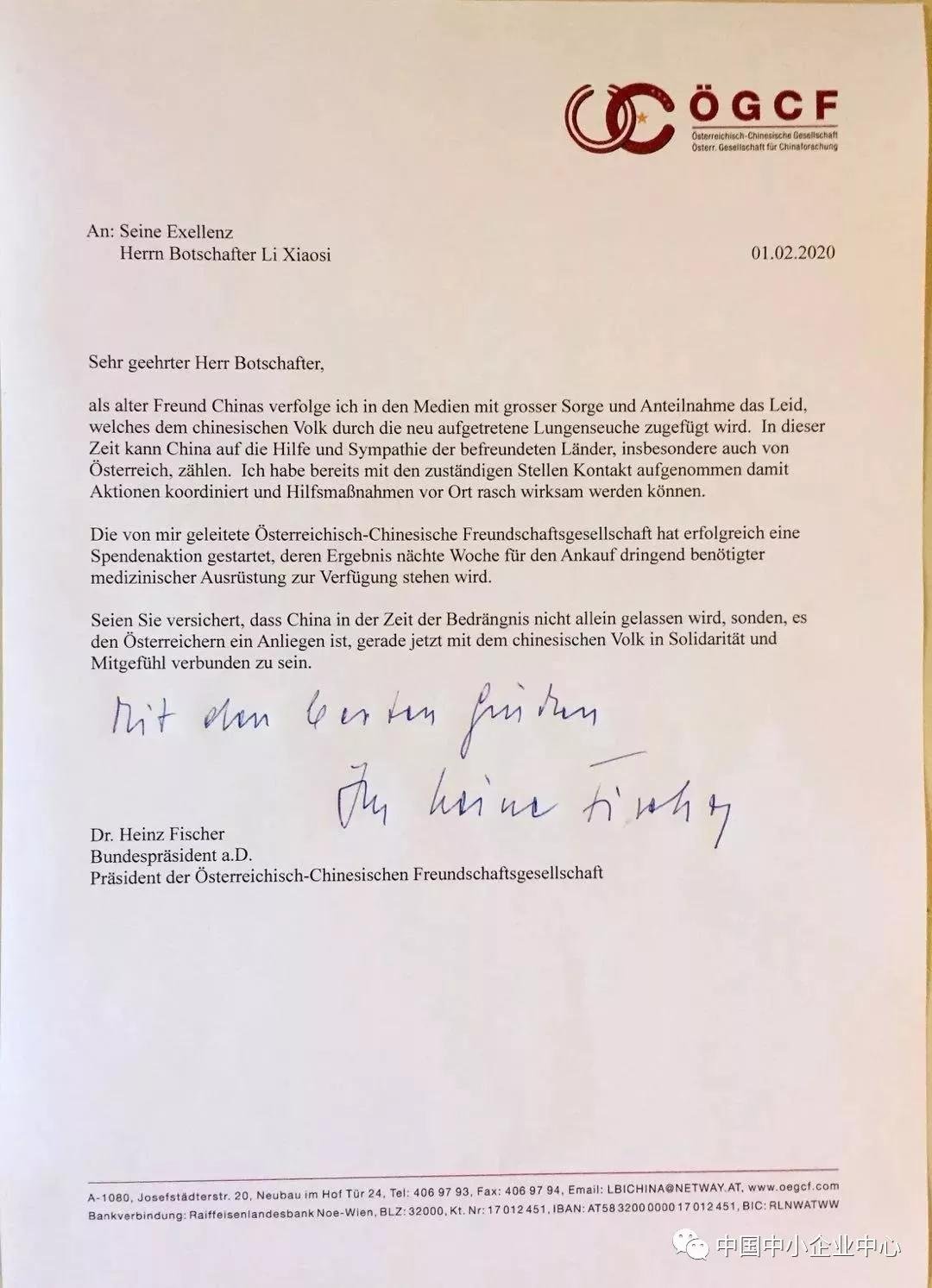 在致李曉駟大使的信中,菲舍爾前總統(tǒng)表示:作為中國的老朋友,我懷著擔(dān)憂和關(guān)切的心情在媒體上跟蹤新型冠狀病毒肺炎疫情帶給中國人民的不幸。在這一時(shí)刻,中國可以指望友好國家,特別是奧地利的同情和幫助。我已與主管部門進(jìn)行聯(lián)系,推動(dòng)協(xié)調(diào)各方行動(dòng),使援助措施能夠盡快發(fā)揮作用。我領(lǐng)導(dǎo)的奧中友協(xié)組織的捐助行動(dòng)已經(jīng)成功開始,下周將用于采購急需的醫(yī)療物資。請(qǐng)您放心,中國在危機(jī)時(shí)刻并不孤單。此時(shí)此刻奧地利人民與中國人民感同身受、團(tuán)結(jié)一致。