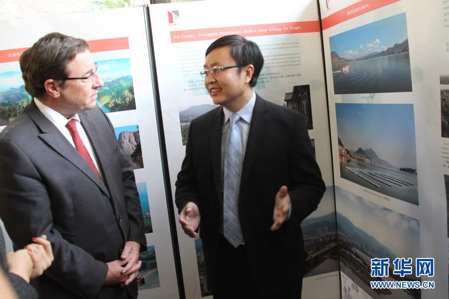 江西省贛州市會昌縣環(huán)境保護局局長李光標(biāo)(右)向聯(lián)合國副秘書長施泰納介紹基層環(huán)保事業(yè)發(fā)展現(xiàn)狀。汪勇基攝