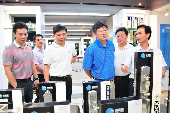 省經(jīng)信委節(jié)能處處長(zhǎng)謝時(shí)超(右三)帶領(lǐng)調(diào)研組參觀聯(lián)合會(huì)金屬制品展廳