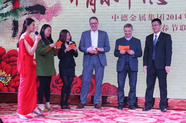 駿馬騰飛成壯舉,靈羊起步赴新程。2015年2月12日,中德金屬集團在榕江大酒店舉辦了以“情系中德·執(zhí)夢遠航”為主題的2014年度總結(jié)表彰大會暨春節(jié)聯(lián)歡晚會。德國歐綠保集團董事會成員、集團COO、綠色燃料合資公司董事馬丁·貝克雷特曼(Martin Becker-Rethmann)、艾薩醫(yī)療技術公司總經(jīng)理邵愛民等外國嘉賓應邀參加此次盛會,與集團領導以及全體公司員工共度了一個難忘而美好的夜晚。