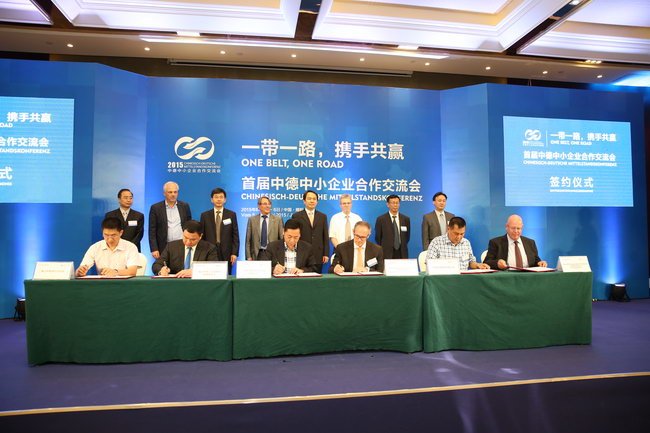 首屆中德中小企業(yè)合作交流會取得豐碩成果。圖為6日下午的合作項(xiàng)目簽約場面。