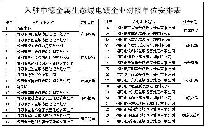 為貫徹落實(shí)全市電鍍產(chǎn)業(yè)發(fā)展推進(jìn)會(huì)會(huì)議精神,全力加快中德金屬生態(tài)城電鍍園區(qū)建設(shè),努力打造綠色電鍍產(chǎn)業(yè)高地,全市各地各部門主動(dòng)作為,加強(qiáng)協(xié)調(diào),形成合力,結(jié)對(duì)支持,切實(shí)幫助入駐園區(qū)電鍍企業(yè)解決投產(chǎn)建設(shè)過程碰到的各項(xiàng)問題,助推企業(yè)盡早投產(chǎn)運(yùn)營(yíng)。根據(jù)安排,市環(huán)保、經(jīng)信、商務(wù)等部門和揭東區(qū)政府等十家單位將對(duì)首批34家入園電鍍企業(yè)進(jìn)行結(jié)對(duì)支持。
