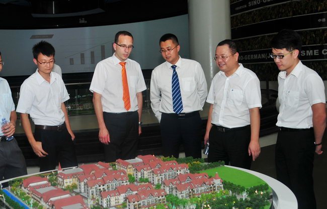 韋寶良(右二)一行參觀中德金屬生態(tài)城營銷展廳,了解項目發(fā)展歷程及與德合作情況