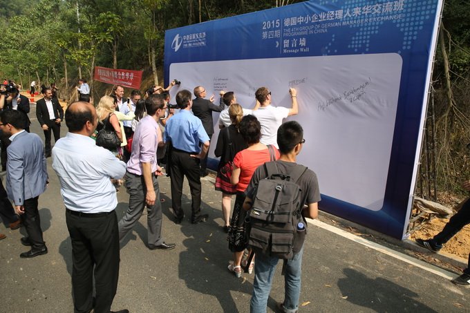 通過實地考察和聽取情況介紹,德國中小企業(yè)經理人對中德金屬生態(tài)城表現(xiàn)出濃厚興趣。在開班儀式后,他們來到了中德金屬生態(tài)城萬畝森林公園植下中德友誼之樹,并在留言墻上寫下寄語。MAE中德咨詢公司執(zhí)行董事馬恩工工整整地寫下“中德合作共贏”六個漢字,而CNGE國際咨詢責任有限公司首席執(zhí)行官托馬斯。諾爾廷則用“非常好”的拼音表達了他對中德金屬生態(tài)城的印象。“我們會再見的,揭陽!”留言墻上記錄了德國中小企業(yè)經理人的熱切期待和美好愿景。