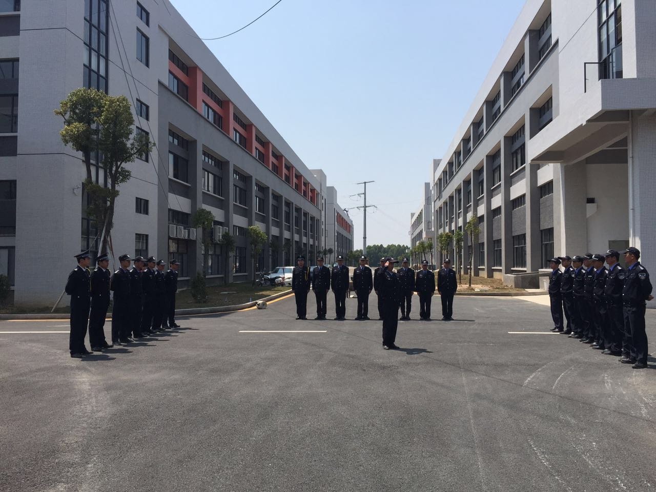 物業(yè)公司保安團(tuán)隊(duì)在消防演習(xí)前進(jìn)行出操訓(xùn)練