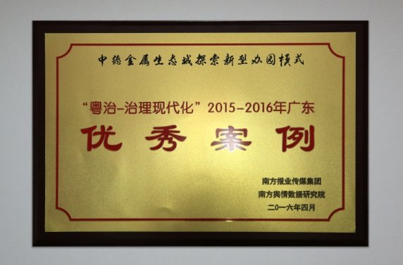 2016年4月26日,第三屆“粵治一治現(xiàn)代化”廣東探索經(jīng)驗交流會在南方報經(jīng)業(yè)傳媒集團(tuán)舉行。在同時發(fā)布的2015-2016年度“粵治——治理現(xiàn)代化”優(yōu)秀案例中,來自廣東揭陽的中德金屬生態(tài)城榜上有名。